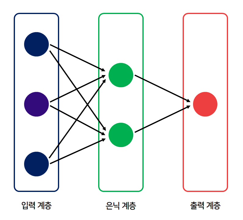 - 입력, 은닉, 출력 계층으로 구성되어 있으며 은닉 계층을 한 개 이상 포함할 수 있고, 각 계층은 여러 노드로 구성된다.