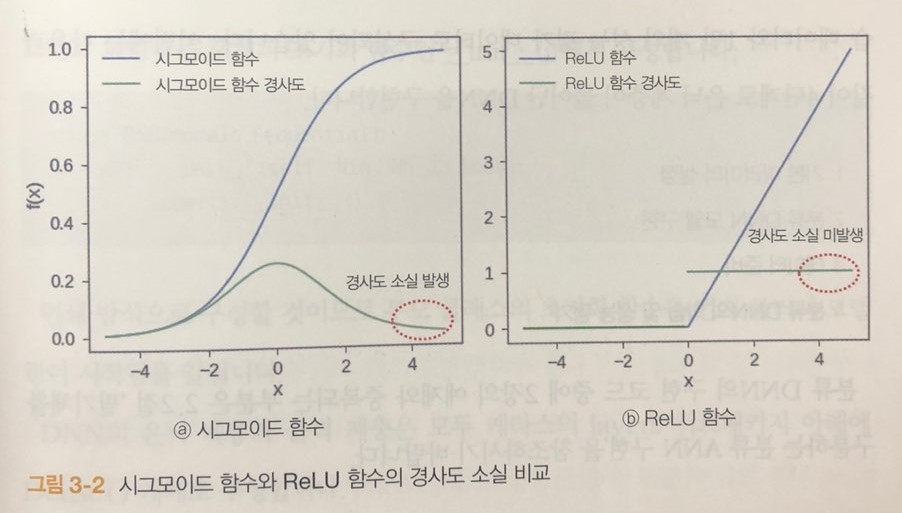 ReLU는 입력이 0보다 큰 구간에서는 직선 함수이기 때문에 값이 커져도 경사도를 구할 수 있음