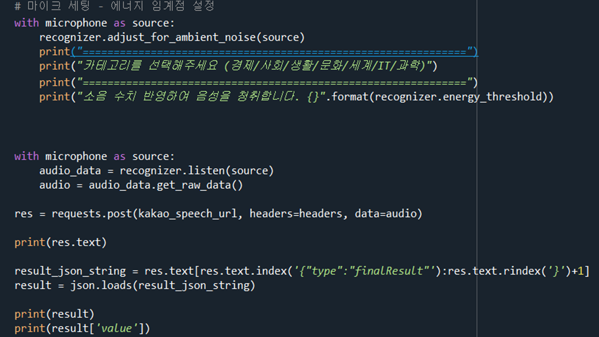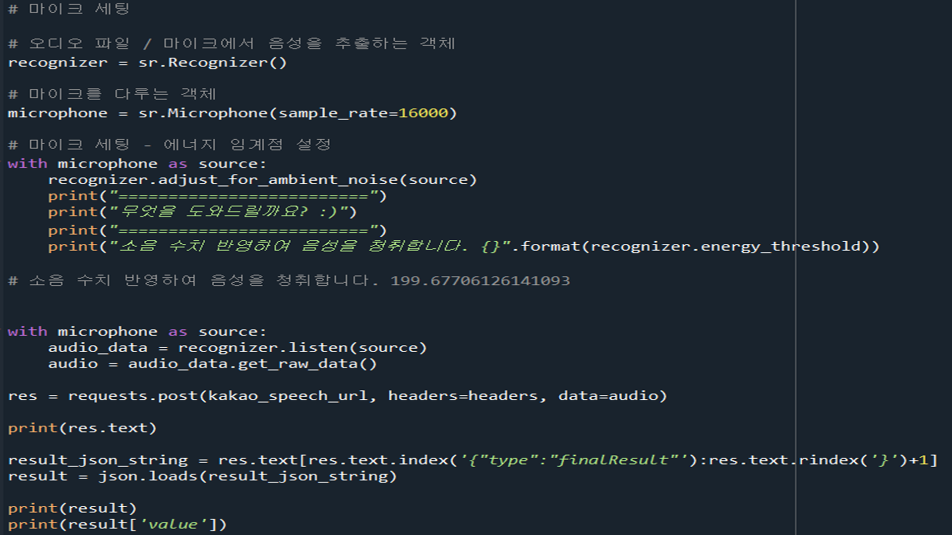1. 음성인식(카카오 음성인식 STT(Speech-to-Text) 사용, SpeechRecognition 마이크 사용)