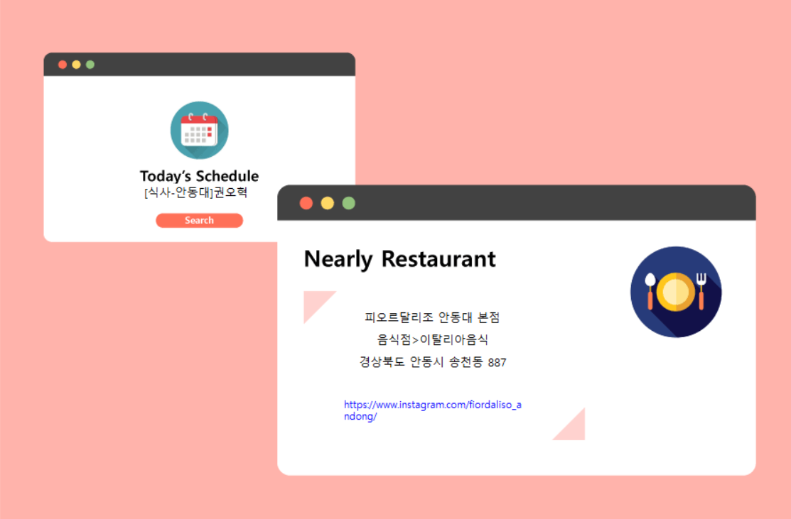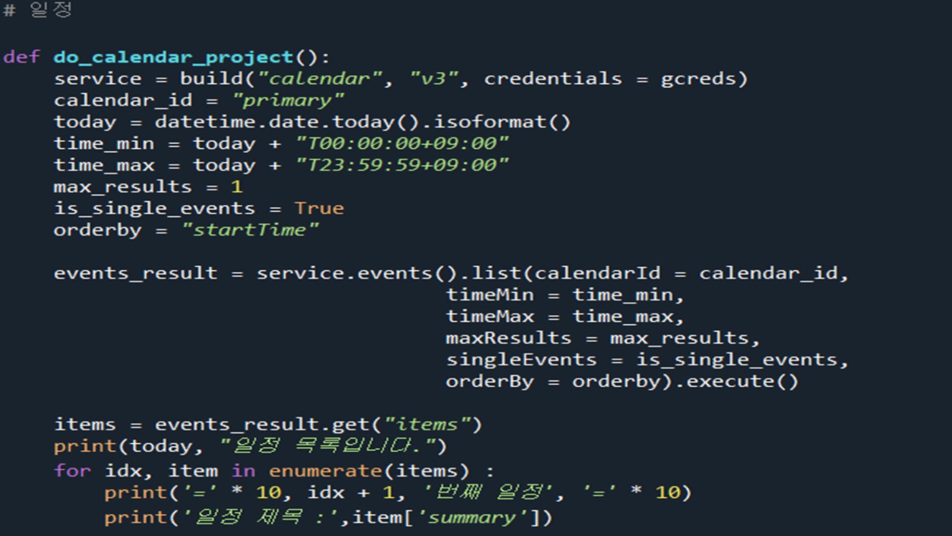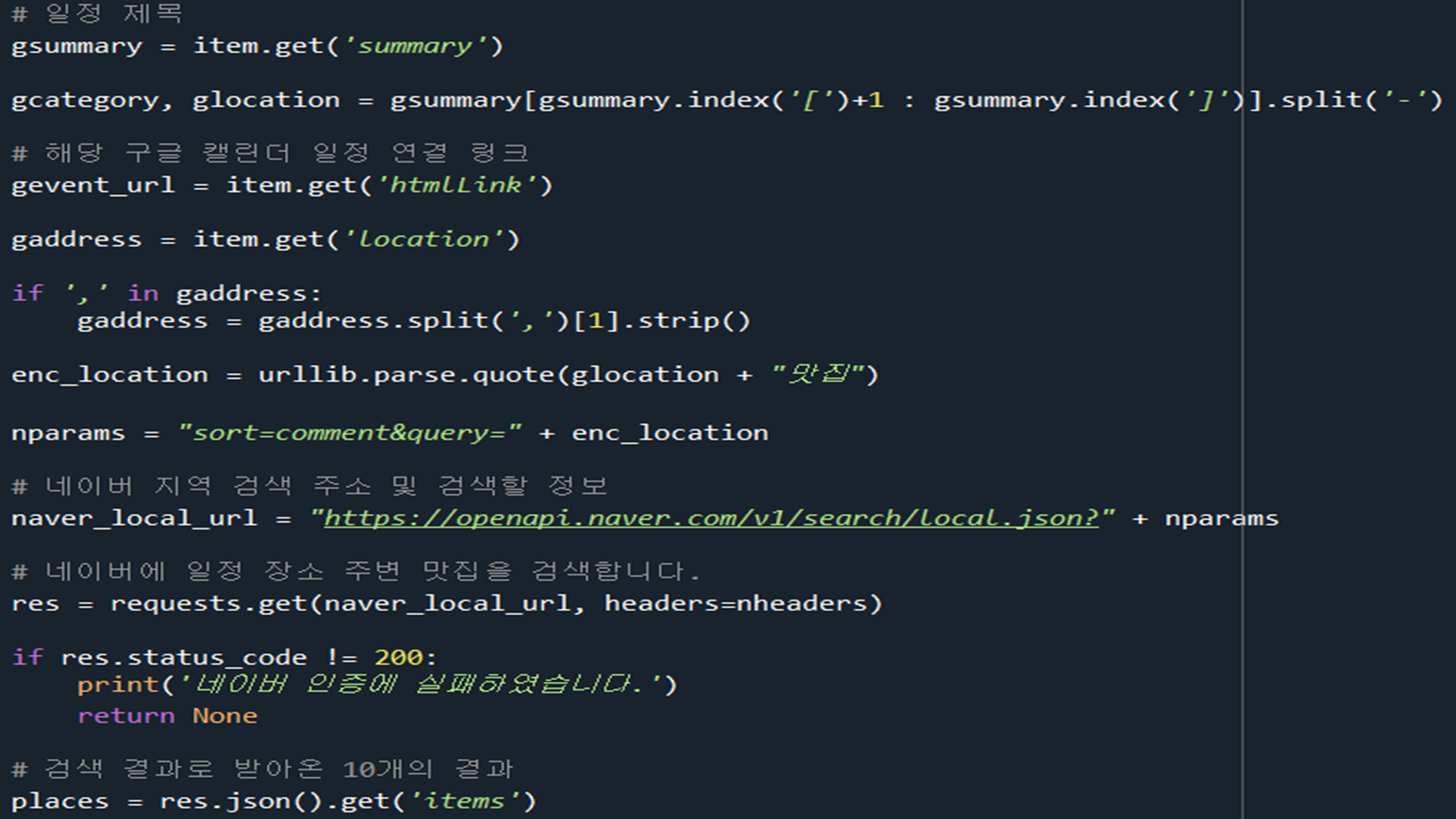 결론 : 카카오 REST API, 구글 캘린더 Oauth 클라이언트 ID json 파일, 네이버 Client Id & Client Secret를 사용하여 만든 프로젝트여서 생소했지만 API와 크롤링 등의 사용법을 배울 수 있었다.
